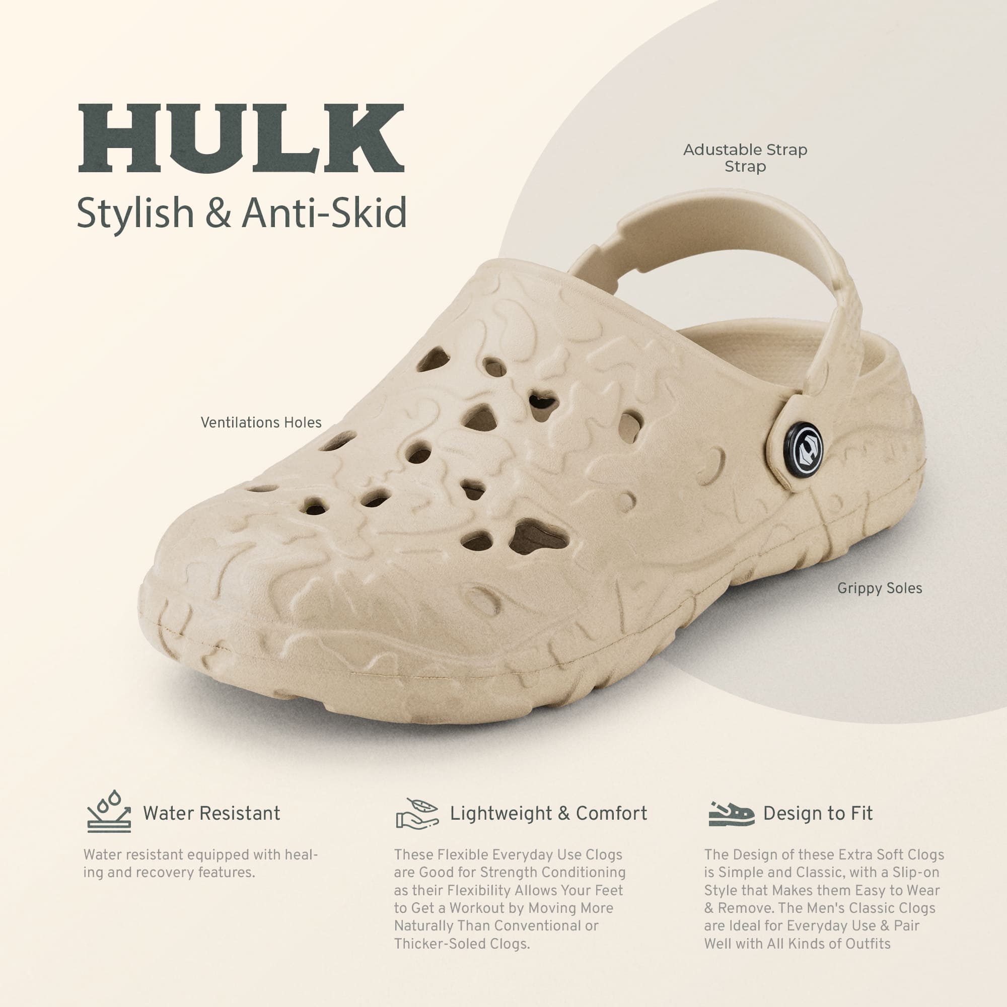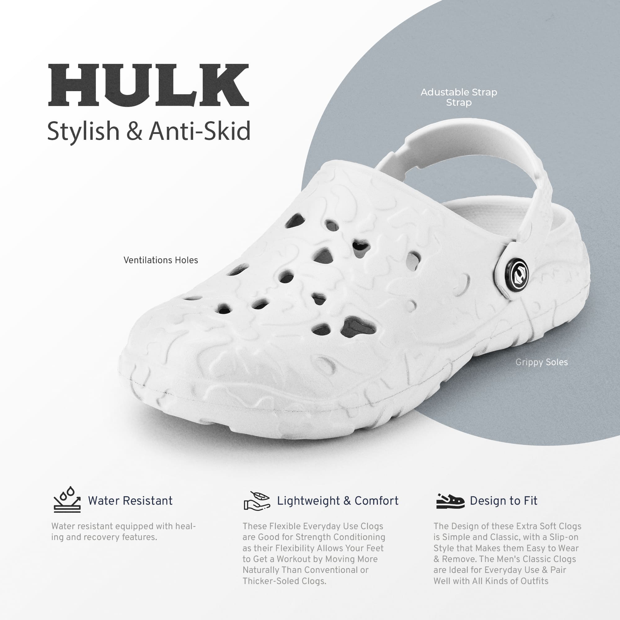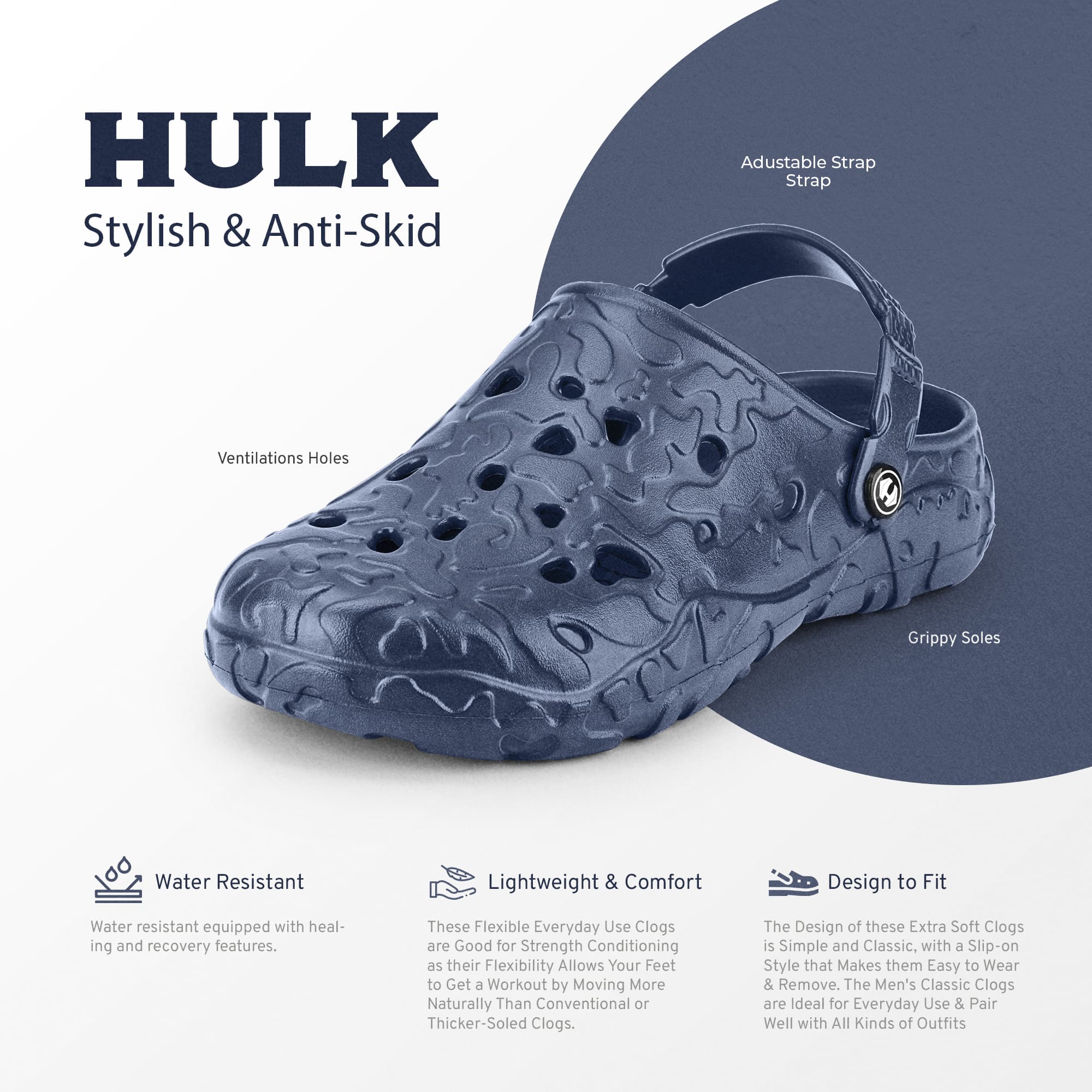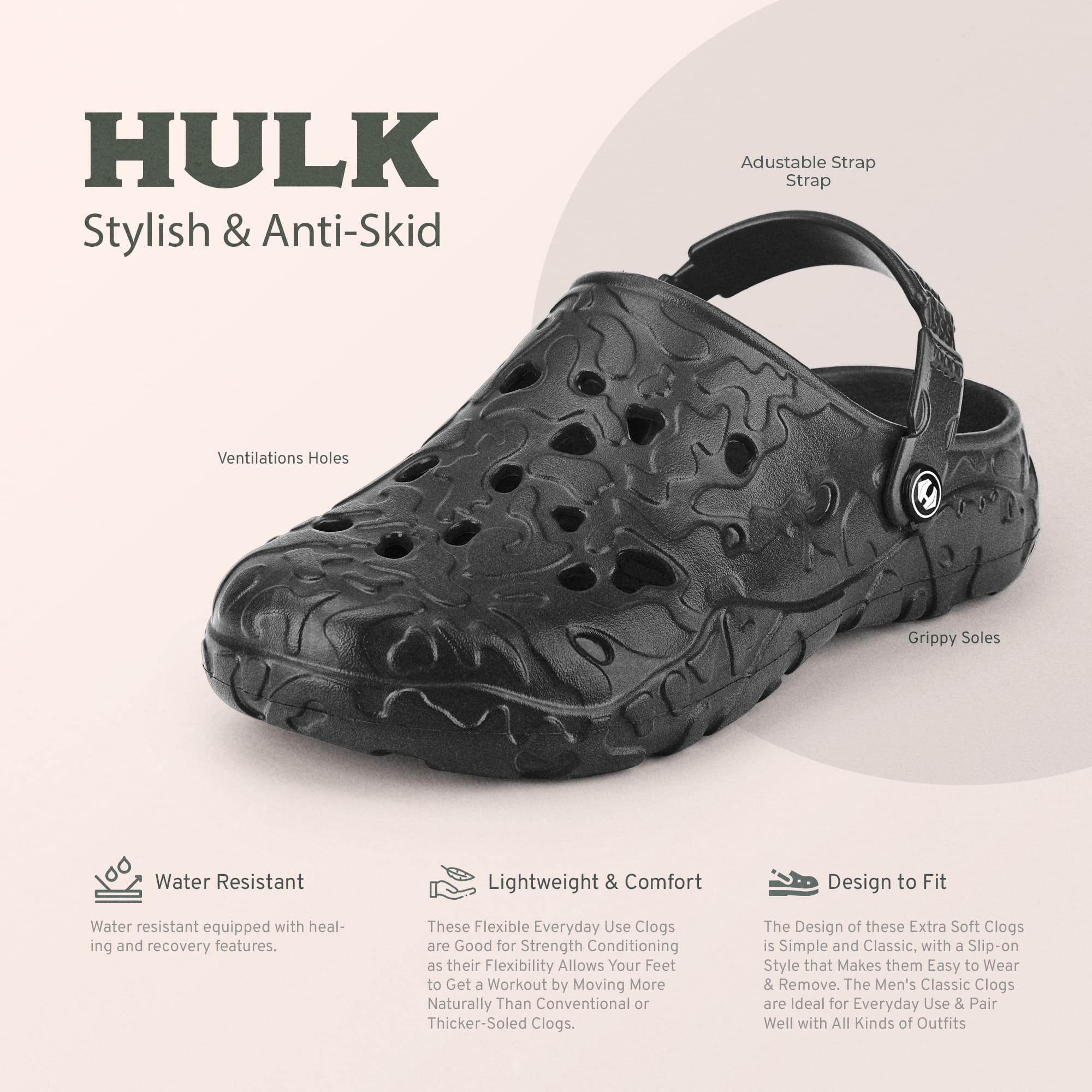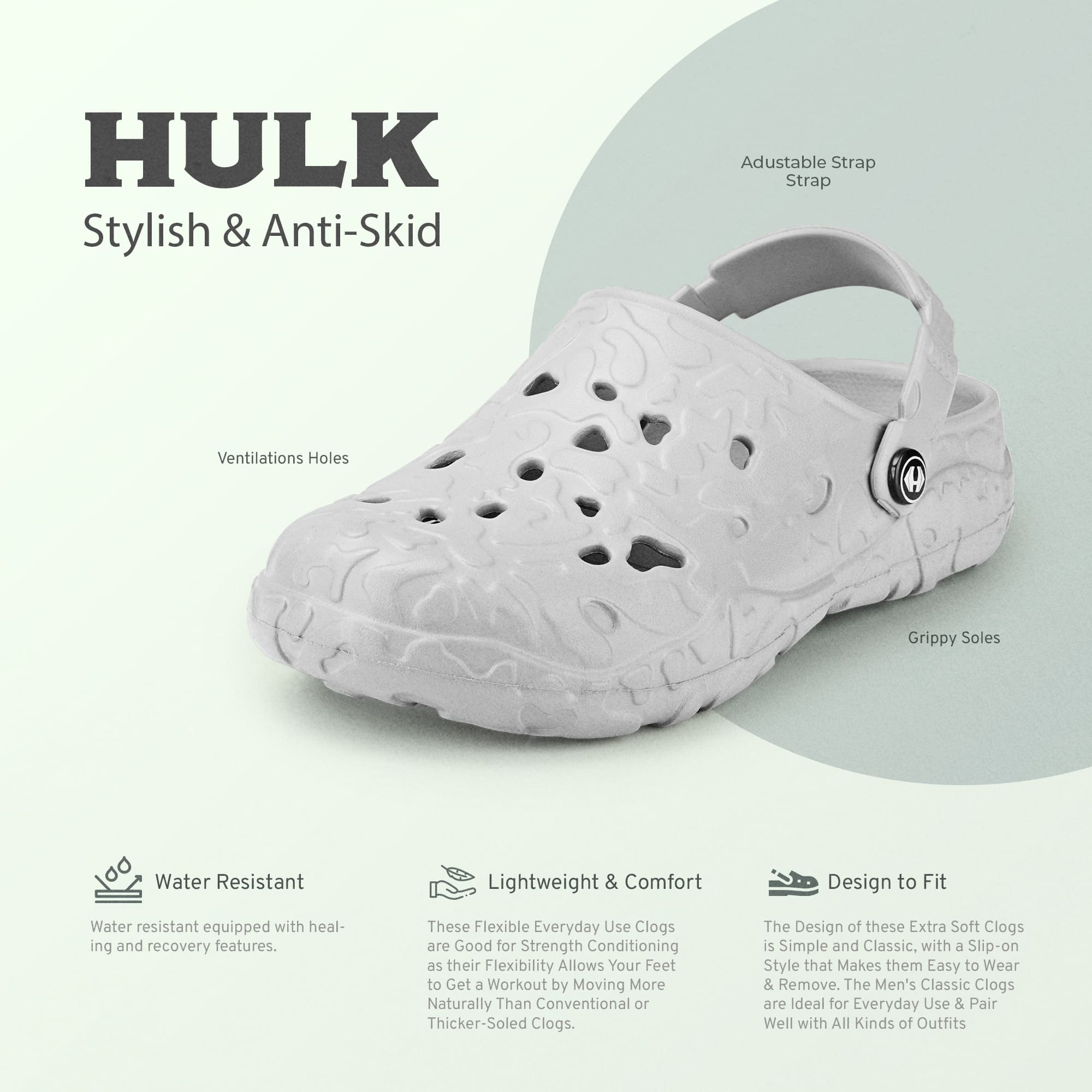 Usually ready in 24 hoursIntroducing the Hoppa Sweden Hulk Men Clogs, designed for durability, comfort, and functionality. These clogs feature a robust build with Hopp Tech R-EVA material, providing excellent water resistance and long-lasting wear. The flat heel and backstrap closure ensure a secure fit and easy on/off access, making them suitable for both indoor and outdoor activities.